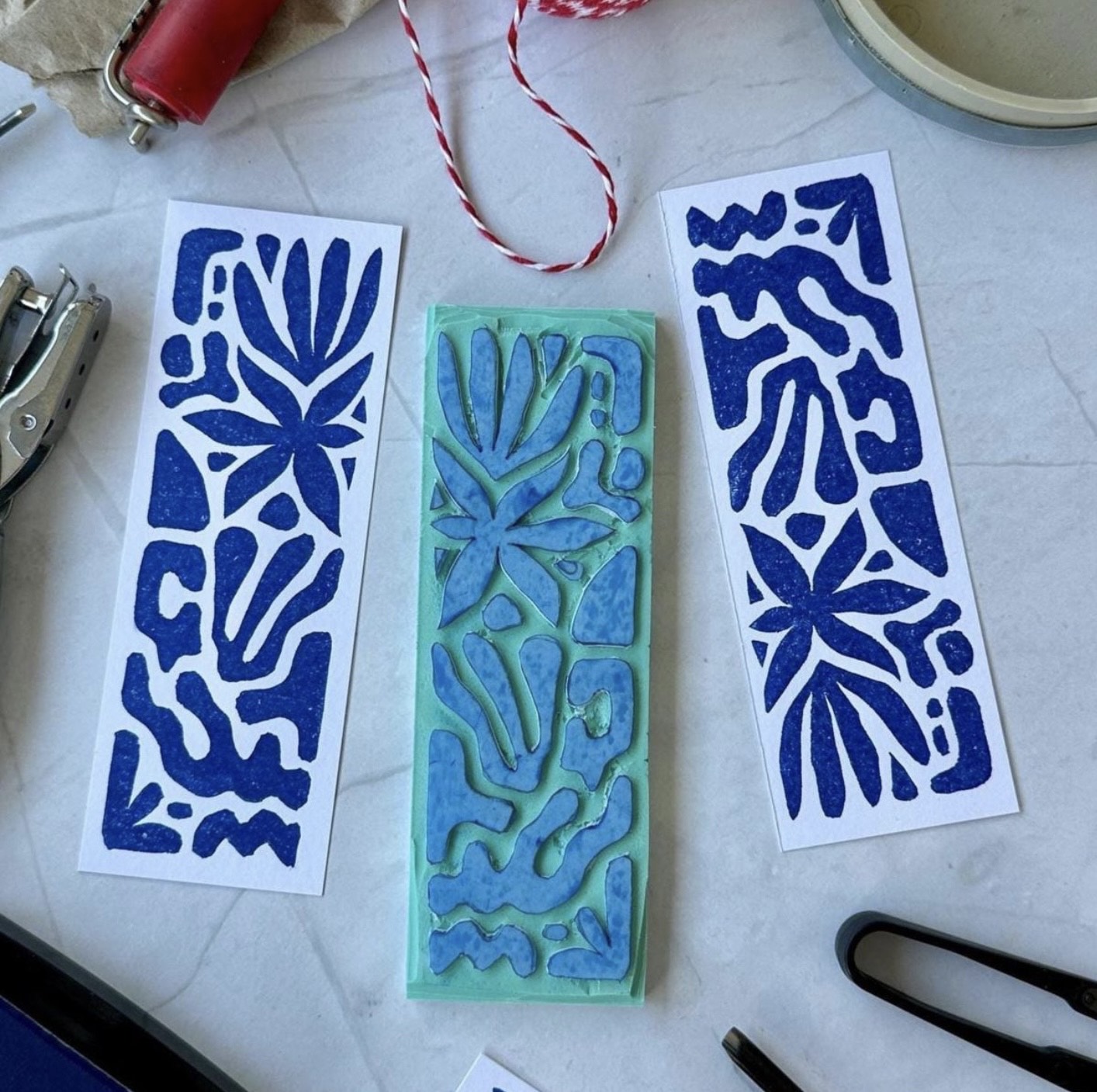 « Initiation à la technique de linogravure. Réalisation de cartes postales et marques-pages à partir de matières réemployées. Créations d’un motif personnalisé à graver puis imprimer en plusieurs exemplaires. «
